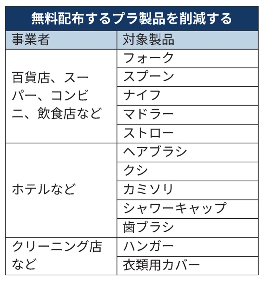 22年4月からの適用を目指す。対象品目は買い物の際に無料で配られるスプーン、ストロー、マドラー、ホテルが提供しているヘア...